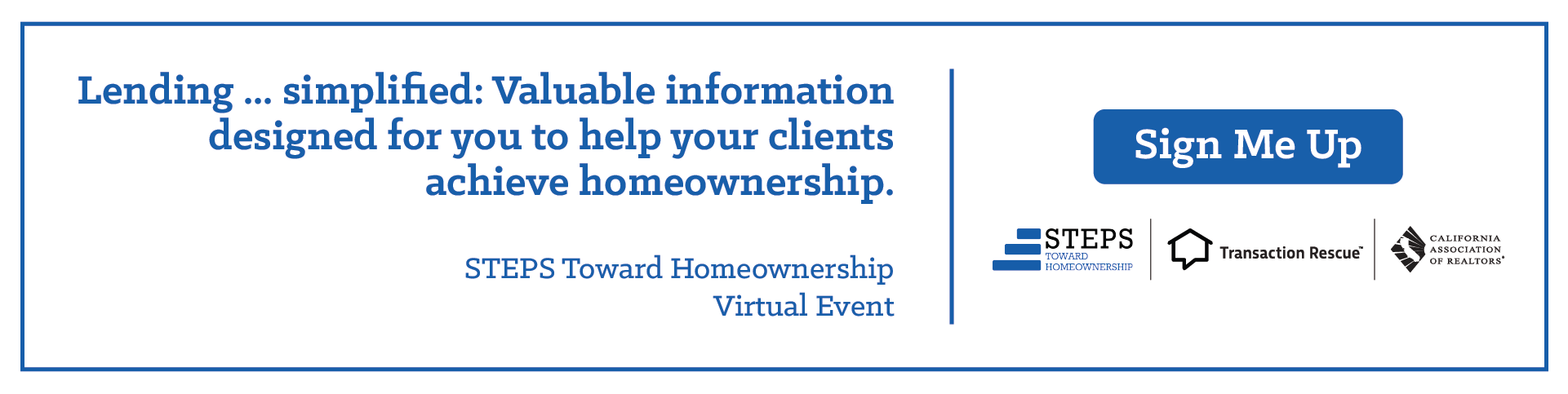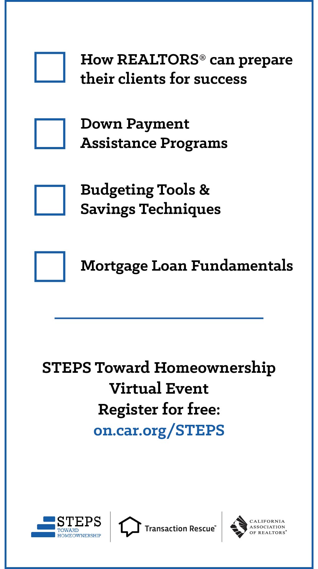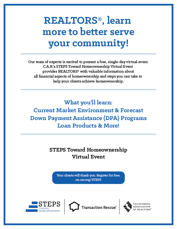 To drive REALTOR® outreach to the STEPS Toward Homeownership Virtual Conference on December 6, 2023, C.A.R. has a variety of graphics and marketing materials available for you. Partner with us on providing key training and educational opportunities to members of your Association through email, online ads, social media, and mailings.